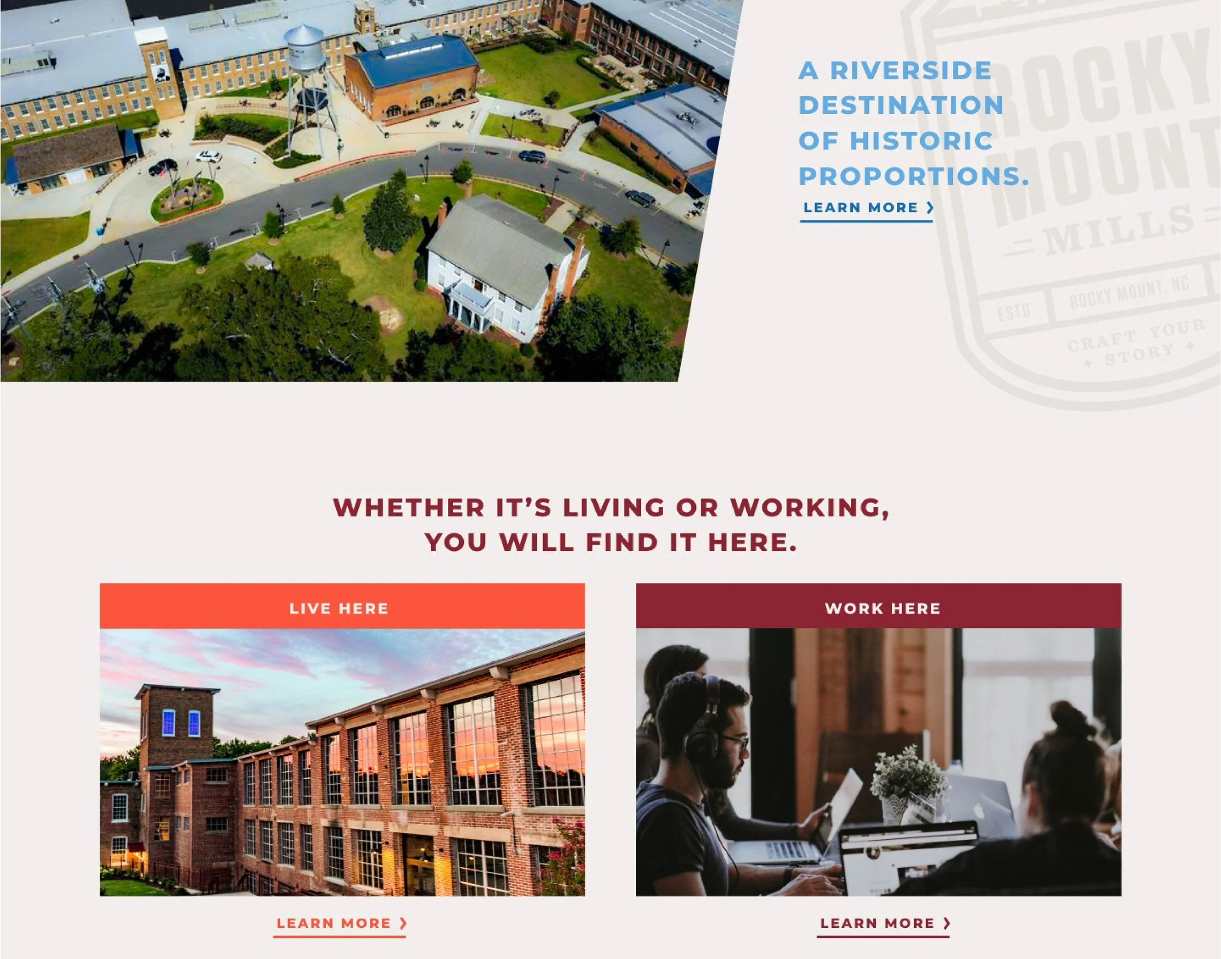 Whether it’s living or working, you will find it a Rocky Mount Mills. Nestled in the hills of North Carolina, this 82-acre campus provides apartments, shops, breweries, vacation spots, and more. This website launched a rebrand for Rocky Mount Mills, providing a fresh take on this historical place. I collaborated with a team of 3+ designers and directors at Caliber Creative to design and execute this website.