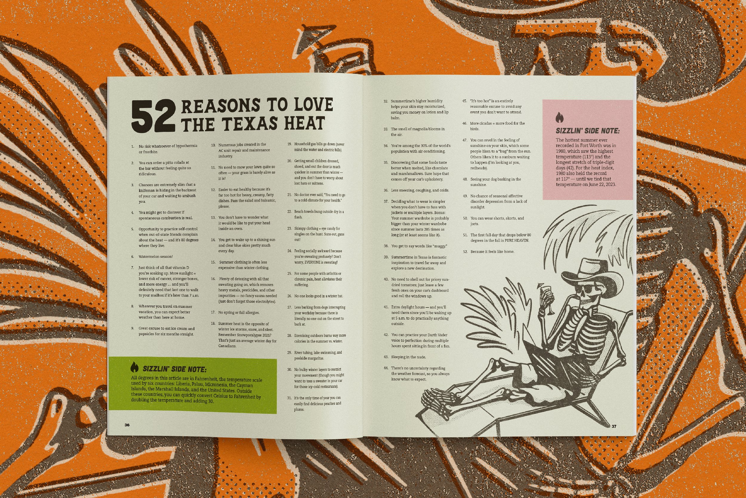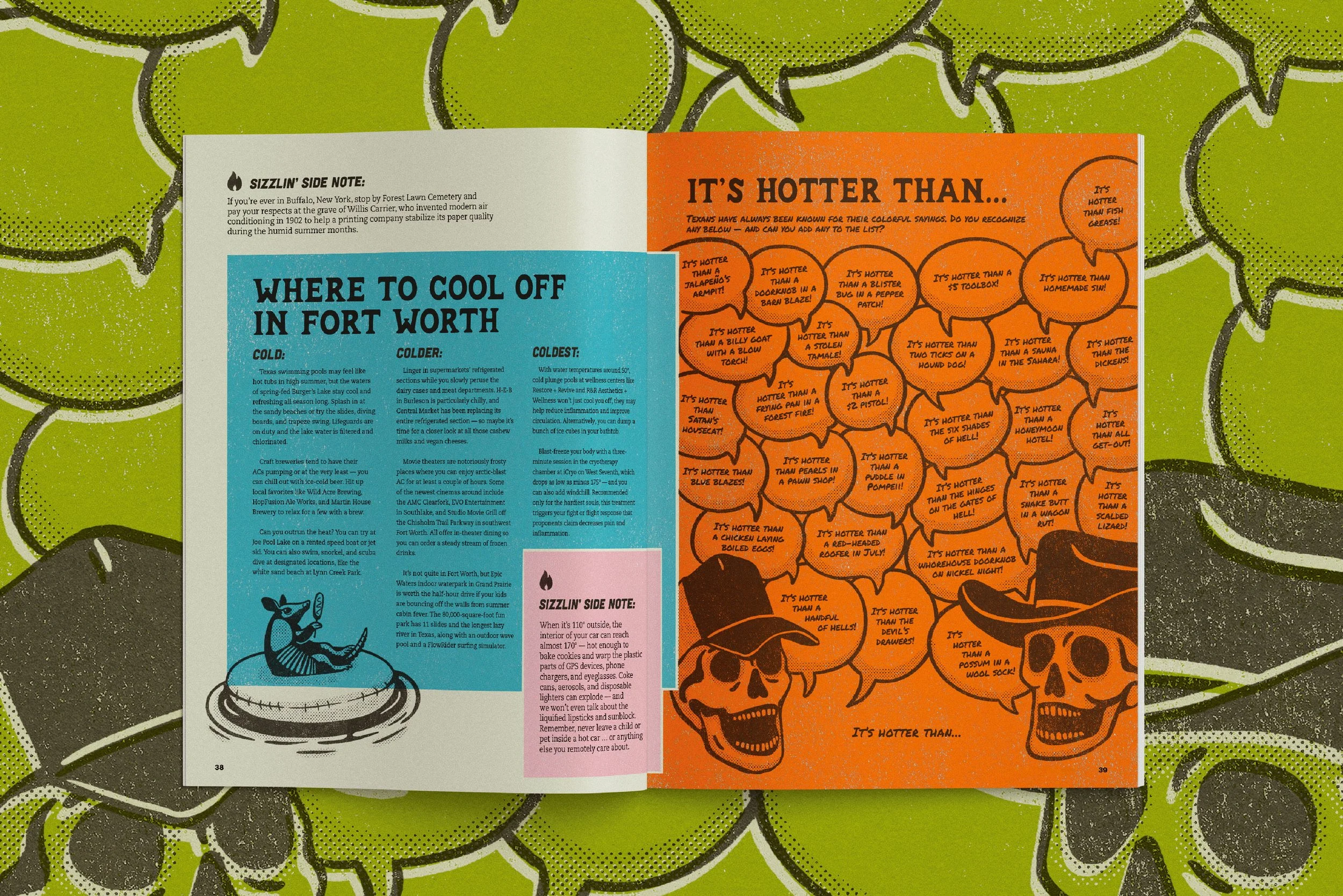 Known as “the definitive resource for where to eat, what to do and what's happening in Fort Worth”, Fort Worth Magazine has been a trusted source in its city for the last 25 years. Their tongue-in-cheek pre-summer feature informed Fort Worthians how to prepare for and ultimately accept the extreme Texas heat. I had the honor of designing and illustrating the graphics for the feature.
